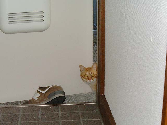 玄関のドアにスニーカーを挟んで少し開けておくと、ベランダと玄関で風が通って部屋の熱気はあっという間に外に出る。今日も日中そうやってると、玄関から近所のノラネコがこっちを見ていた。
