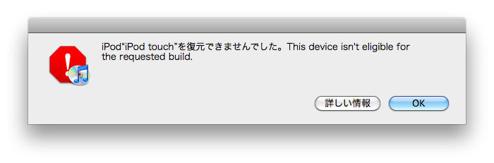 現状では3.1.2に戻すのは簡単ですが、touch用のOS3系の最終バージョンだった3.1.3にはできませんでした。やろうとすると、Appleのサーバーを見に行ってエラーになります。