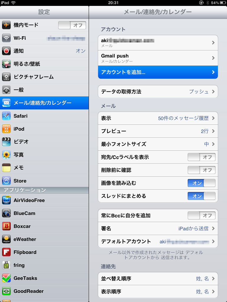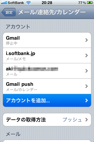 MobileMeのアカウントが追加されて「未確認」となります。MobieMeのアカウントに設定したメールアドレスに届いているメールに従って確認操作をすると「確認済み」になるので、再びMobileMeのアカウントをタップします。