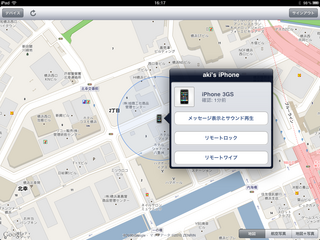 サインインしたMobileMeアカウントを使って有効にしてあるiOS機がリストに表示されるので、探したいデバイスを選択すると、マップ上に表示されます。