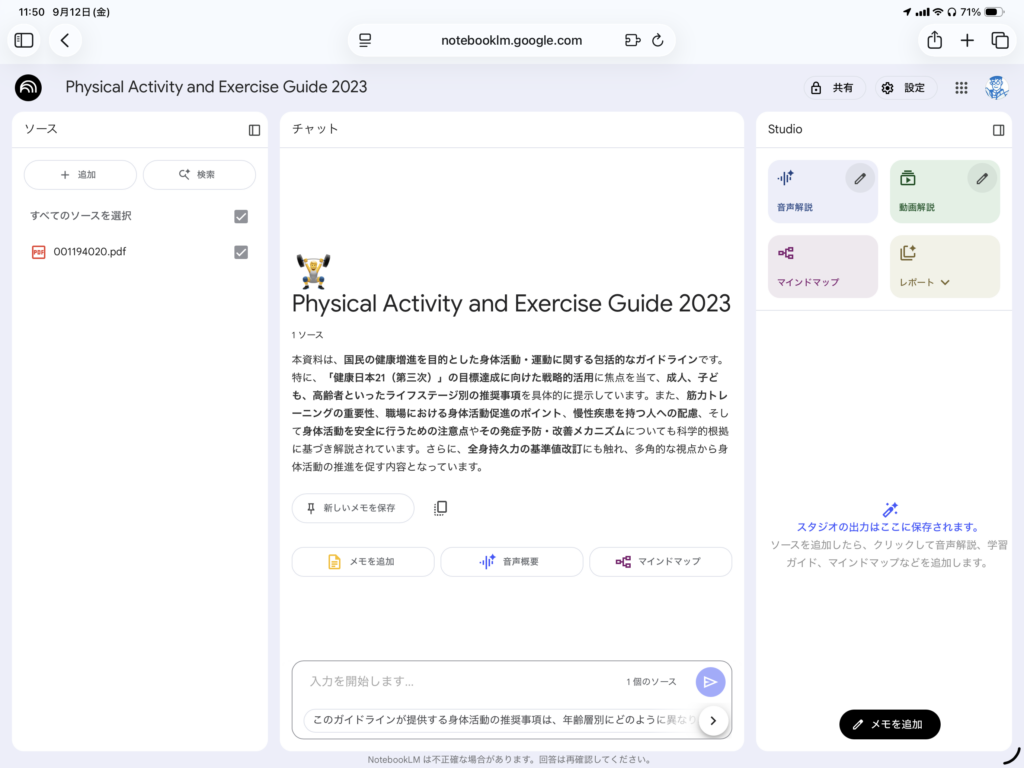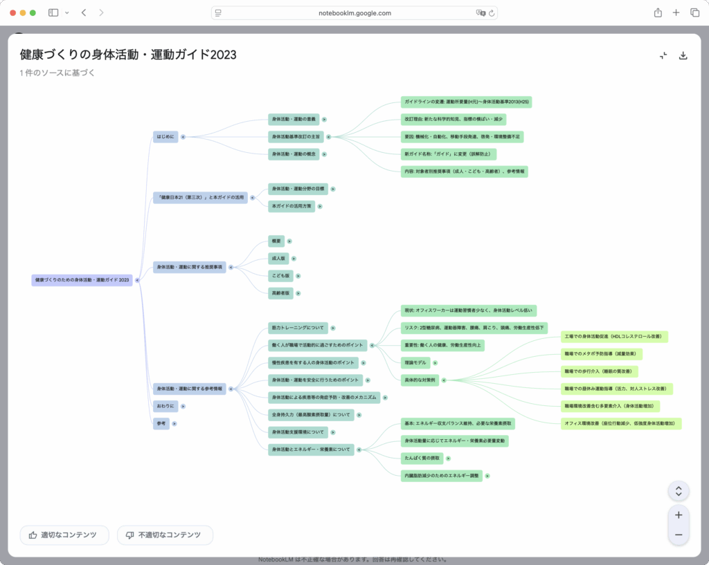 さらに動画だけではなく、音声だけの解説やマインドマップといった別のアウトプットも生成できます。読む・聴く・全体構造で把握するという複数のアプローチが選べるため、従来のAI要約よりも学習や業務での使い道が広がっていると感じます。