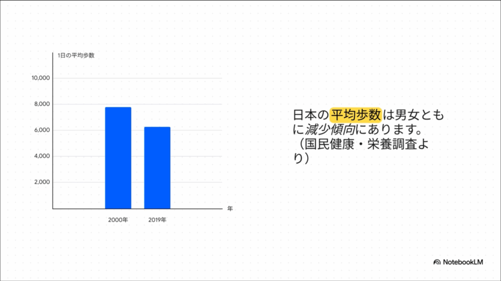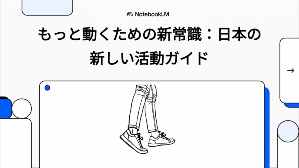 NotebookLMにアップロードした資料をもとに、AIが自動で「解説動画」を作ってくれる機能です。単なる要約ではなく、スライドに整理し、日本語ナレーションを加えて、見て理解できる形式に変換してくれるものと考えればよいでしょう。文章で読むと時間がかかる長いレポートや複雑な資料でも、数分の動画にまとめて視覚と聴覚で理解できるのが大きな特長です。