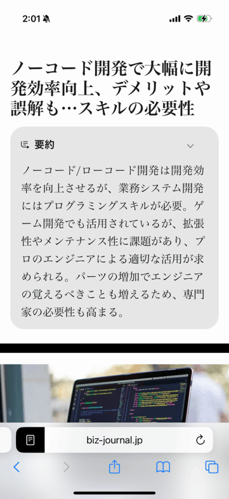 標準のWebブラウザー「Safari」でも要約機能が使える。内容を素早く把握するのに便利な機能だ。画面表示を「リーダー」モードに切り替えると、画面上部から要約機能が利用できるようになる。
