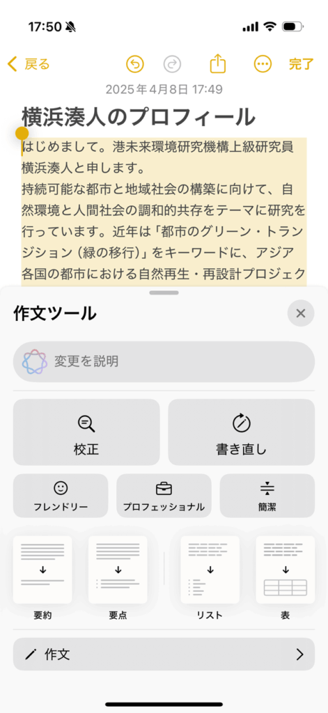 Apple Intelligenceの「作文ツール」は、文章の校正や書き直しのための機能。対応アプリでテキストを扱う画面などから呼び出して使える。