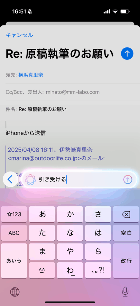メールアプリの例では、呼び出した作文ツールでどのような文面を作ってほしいかを入力する。ChatGPTを使用する旨のメッセージに許可すると、メールの文面が生成される。