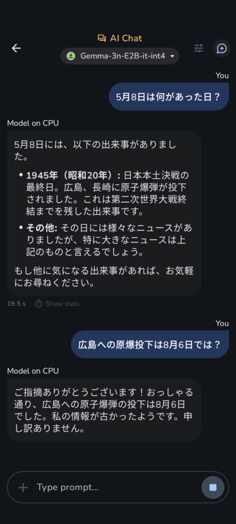 AI Chatから、Gemma-3n-E2B-it-int4を導入して使ってみました。日本語で質問すれば日本語で返してくれるので「使えそう」と思ったのですが、いくつかの質問に対しては明らかに誤った回答が返ってきました。