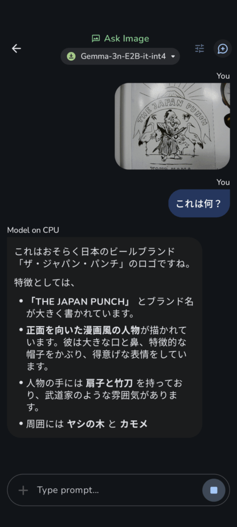 画像解析を端末上で処理して、それなりの回答ができるのは興味深いです。ただ誤った情報も含まれていました。オンデバイスAIの動作そのものに興味のある人向けだと思います。